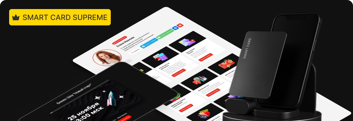 Красивая NFC-карта — человек подносит телефон и сразу видит ваши контакты и витрину продуктов. Никаких долгих объяснений.