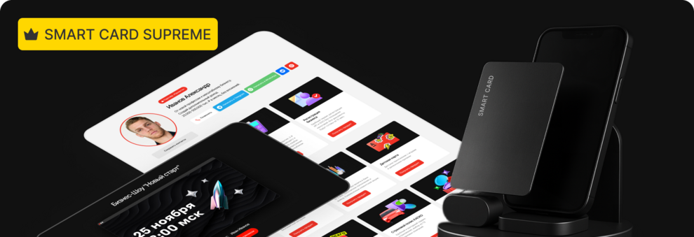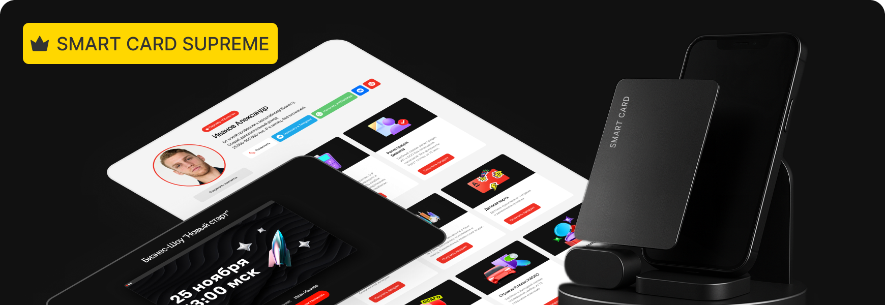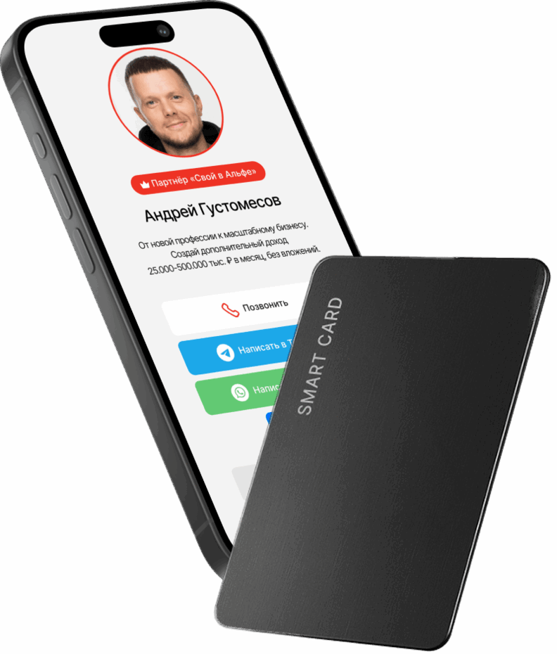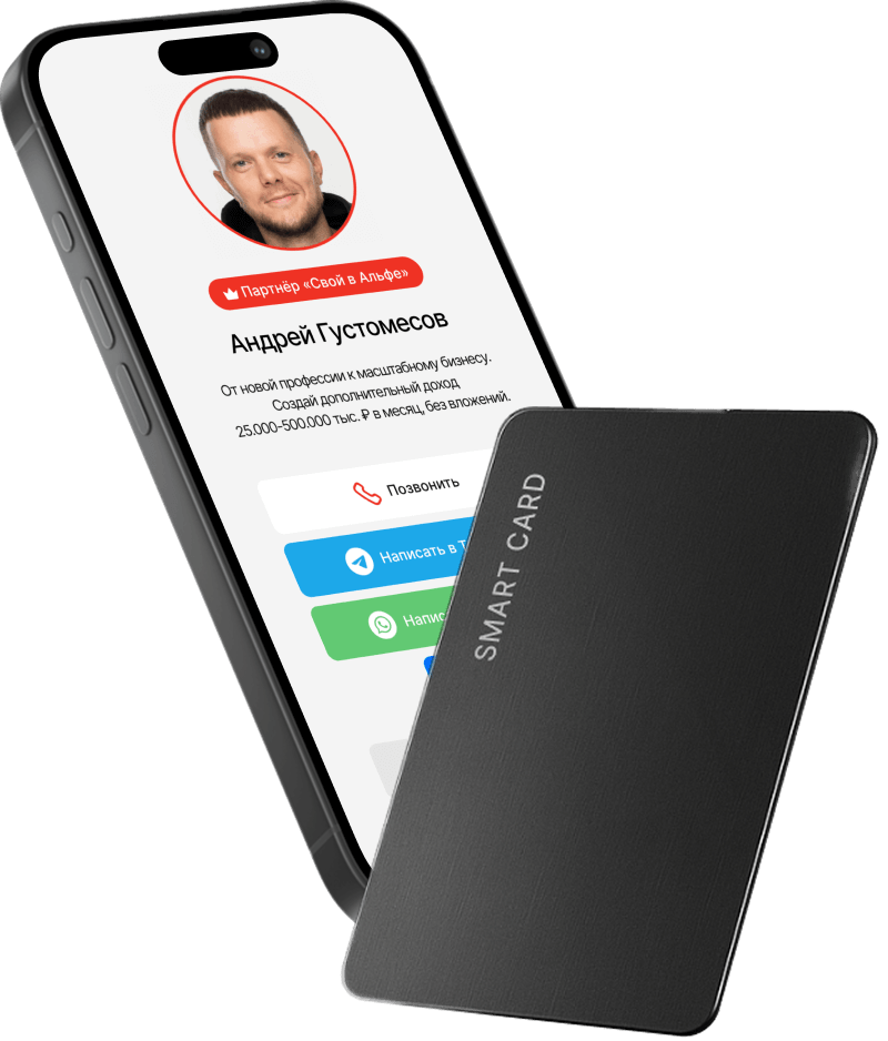 Красивая NFC-карта — человек подносит телефон и сразу видит ваши контакты и витрину продуктов. Никаких долгих объяснений.
